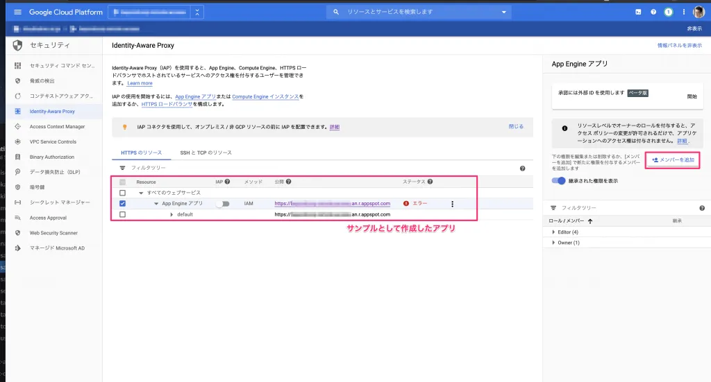 Identity-Aware Proxyに作成したサンプルアプリケーションが表示されてました。