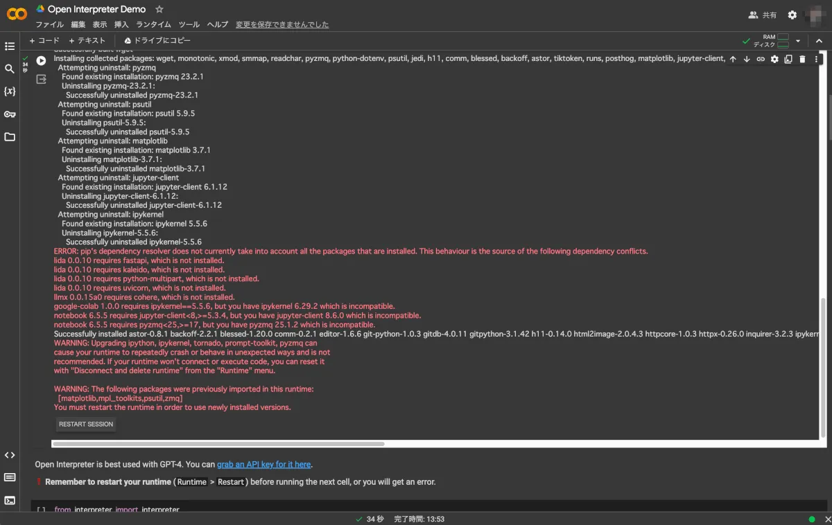Open Interpreter公式がGoogle ColabにDemo環境を用意しているのですが、Open Interpreterのインストールに失敗し、デモが動かない状態となっています。