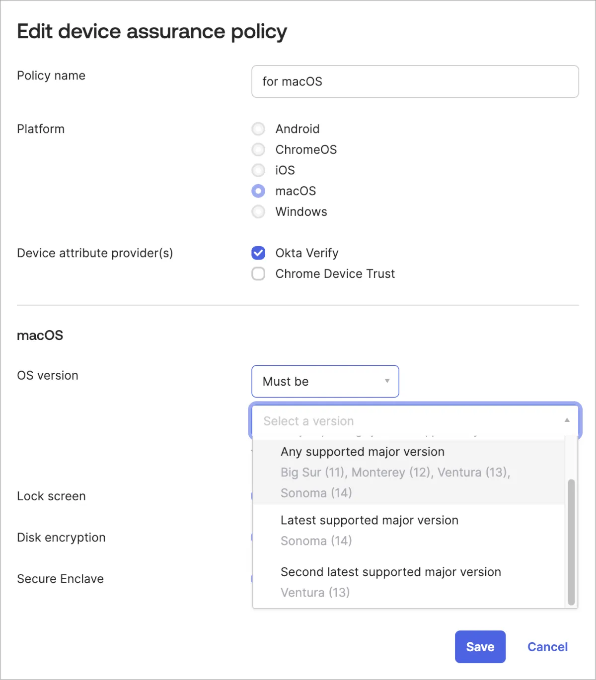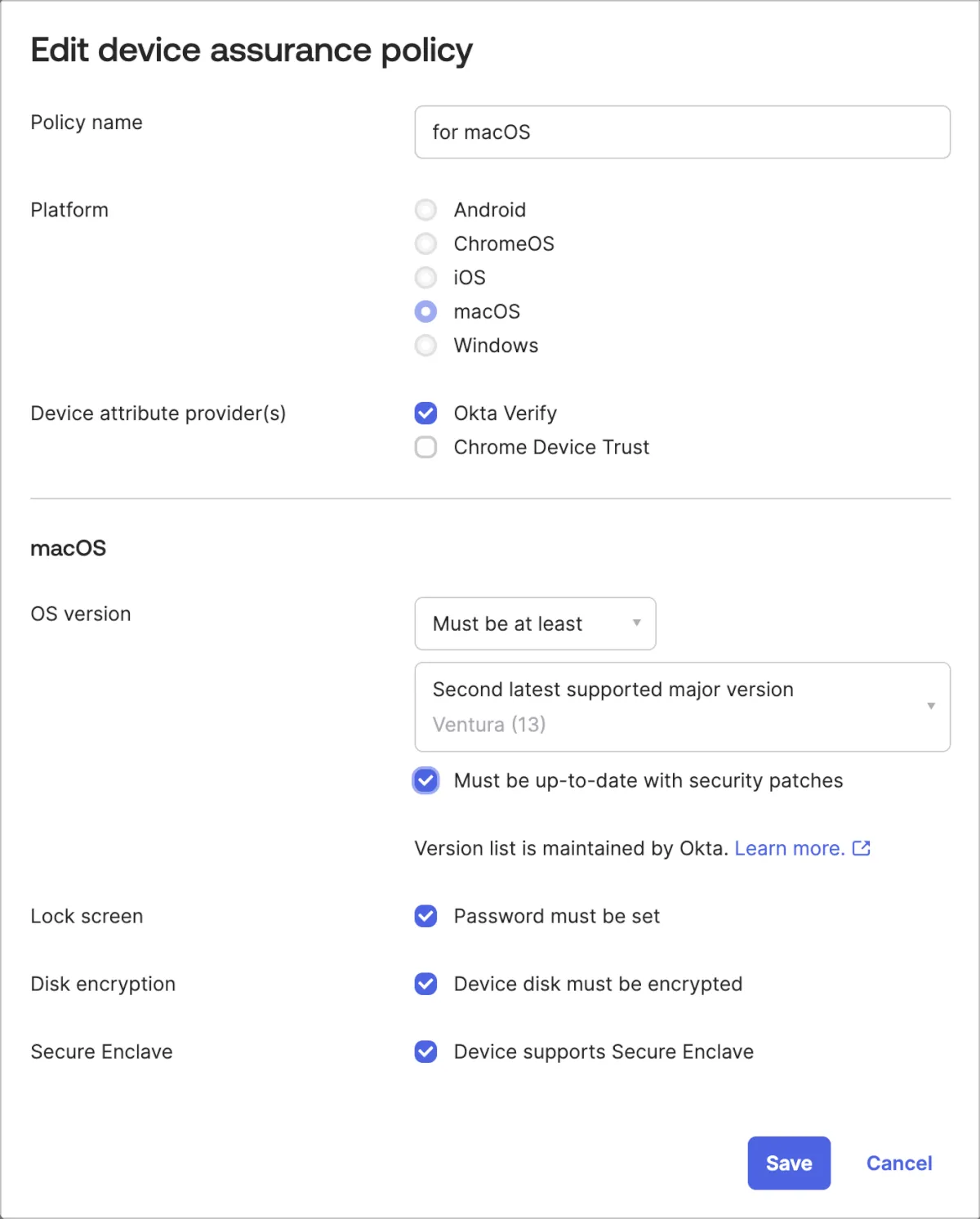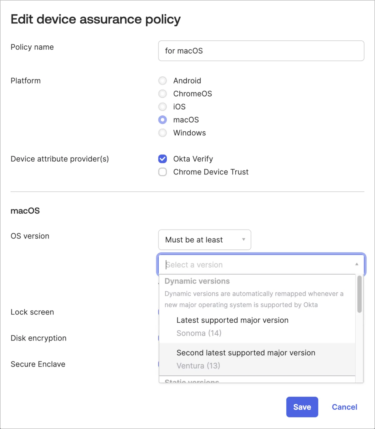 You can configure OS version compliance by using device assurance. However, you have to manually update the policies every time a new OS version or patch is released. With Dynamic OS version compliance, Okta updates device assurance policies with the latest OS versions and patches, eliminating the need for manual updates. With this feature you can ensure OS version compliance in your org without tracking OS releases. See Add a device assurance policy.