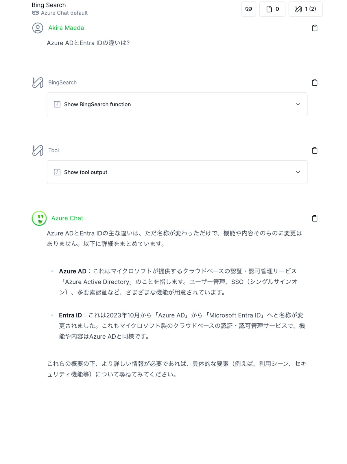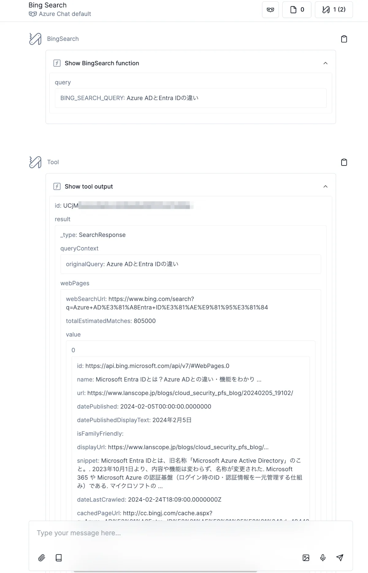 同じ質問をするとこちらはBing Search APIを利用し、最新の情報を取得し、生成AIでまとめてくれているため回答は正確です。
