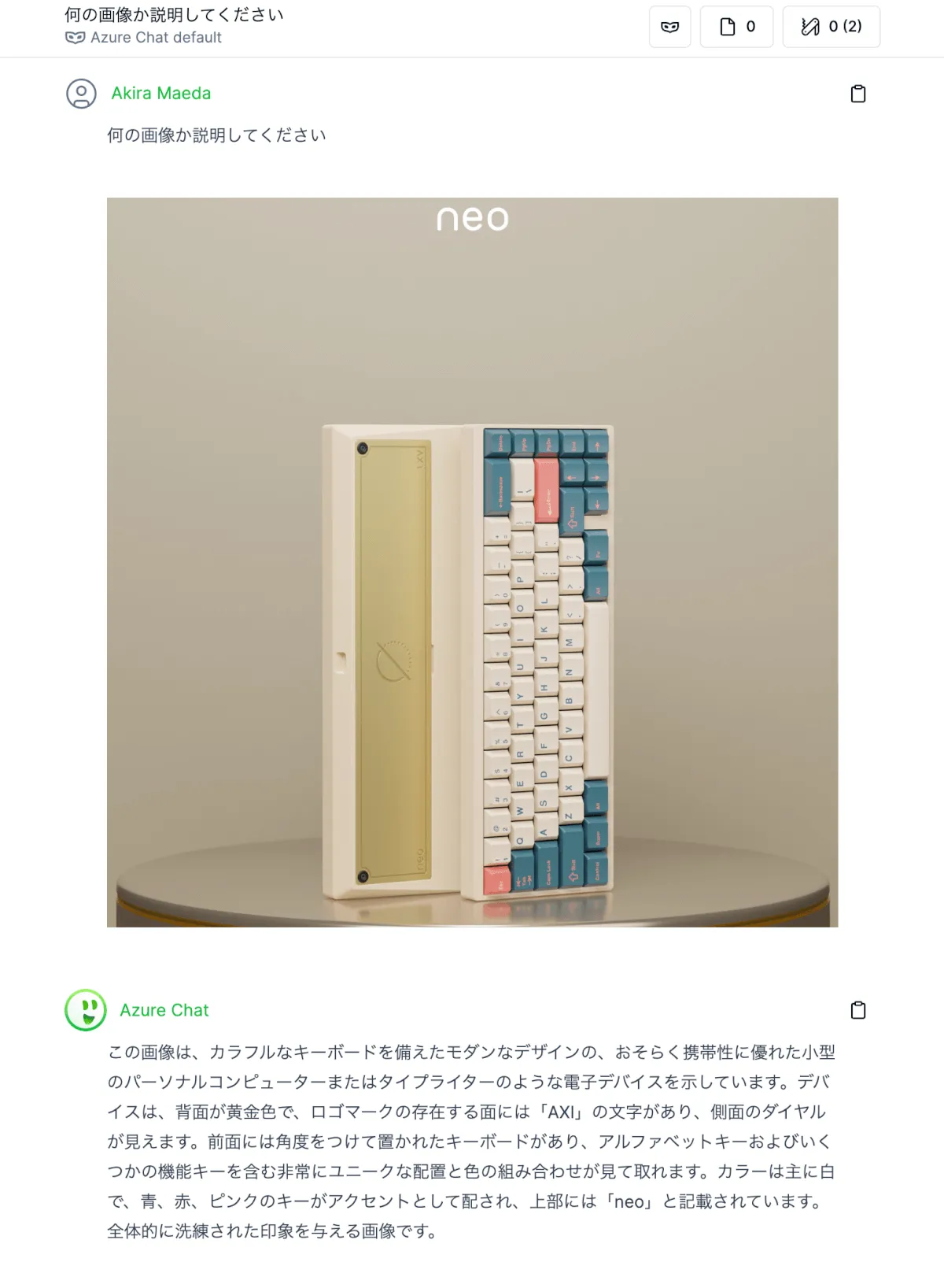 Azure Chat上で画像をアップロードすると、画像認識が行われ、画像に関する質問に対するテキスト応答が返ってきます。