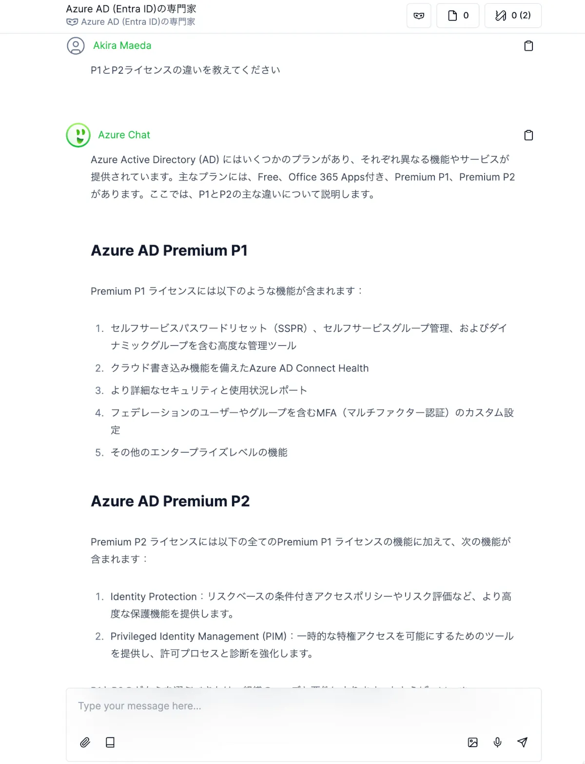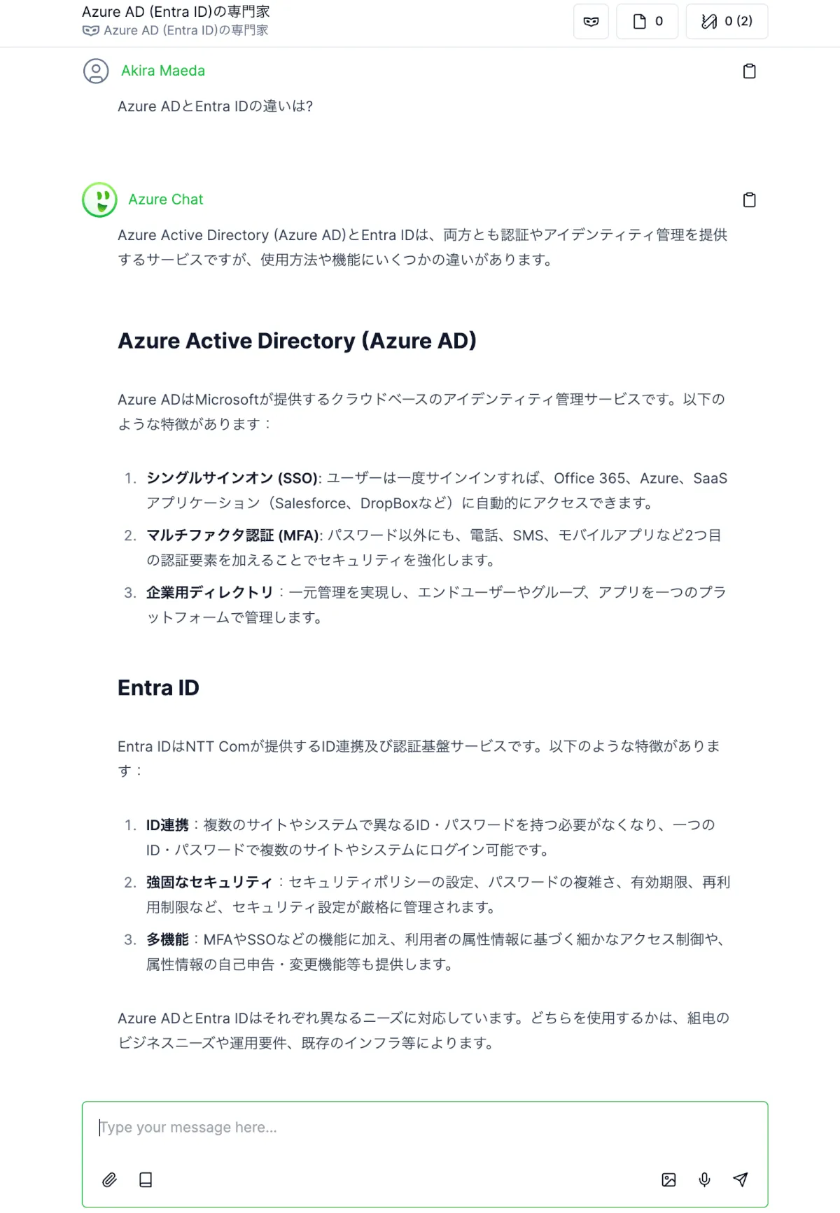 Azure ADとEntra IDの違いについて質問したところ、「ハルシネーション(もっともらしいウソ)」が発生。