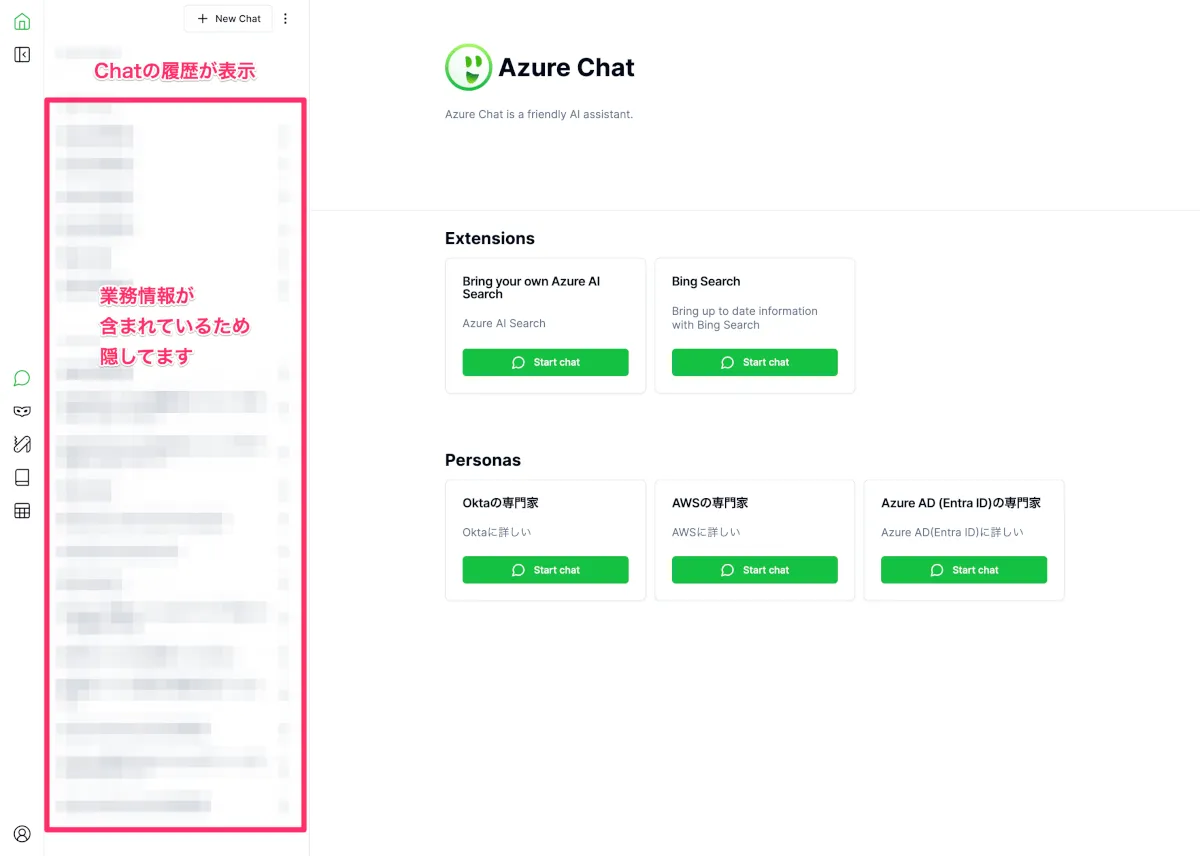 - Azure Chatは、Microsoft社製のプライベートAIチャットで、Azure上やオンプレ環境で稼働させることが出来ます。