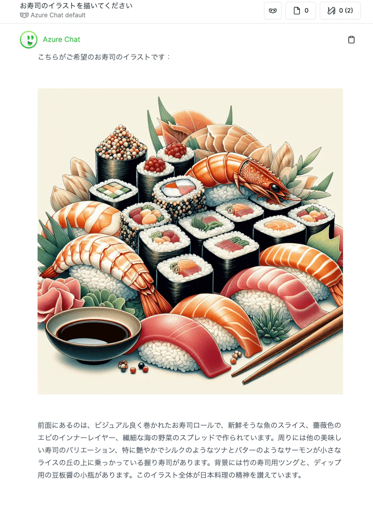 「〇〇のイラストを描いてください」と指示を出すと画像が生成されます。試しにお寿司のイラストを描いてもらいましたがなんだかゾワゾワする感じです。