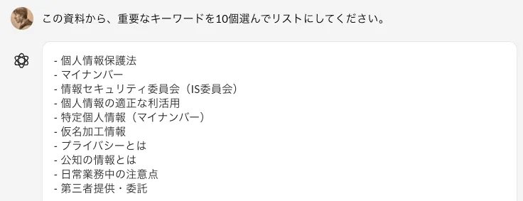 この資料から、重要なキーワードを10個選んでリストにしてください。