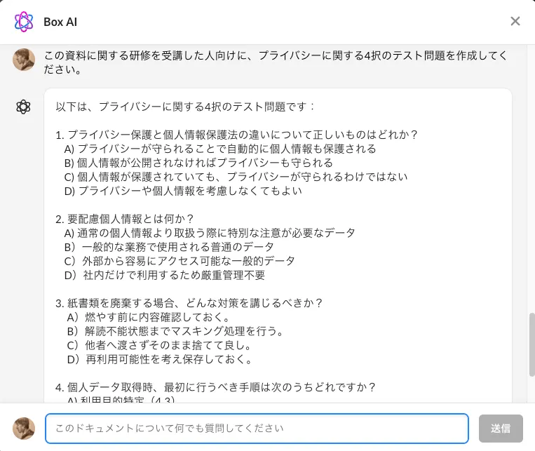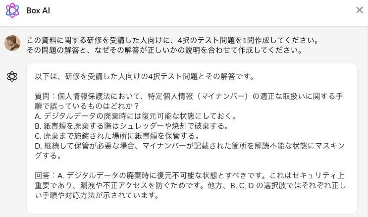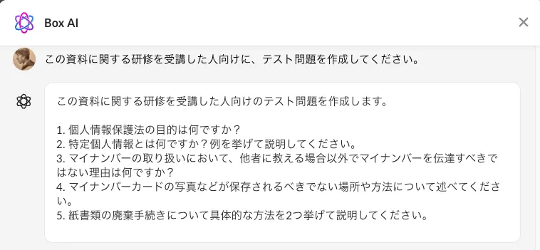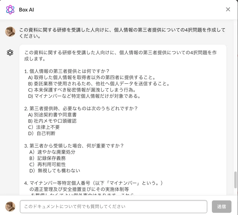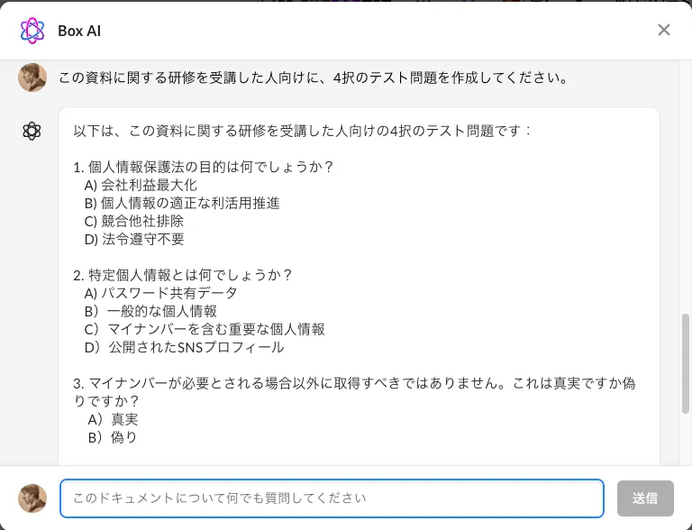 弊社ではBox AIという便利なものが使えるので、そこから問題を生成すれば楽ができるはず!