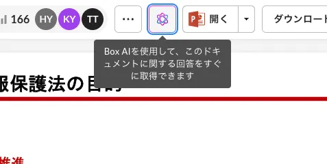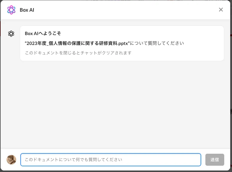 対象のBoxファイルを開き、Box AIのアイコンをクリックすれば入力フォームが開きます。