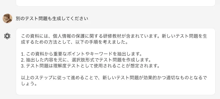 - 資料の内容に沿った問題・解答・解説を生成することができた。