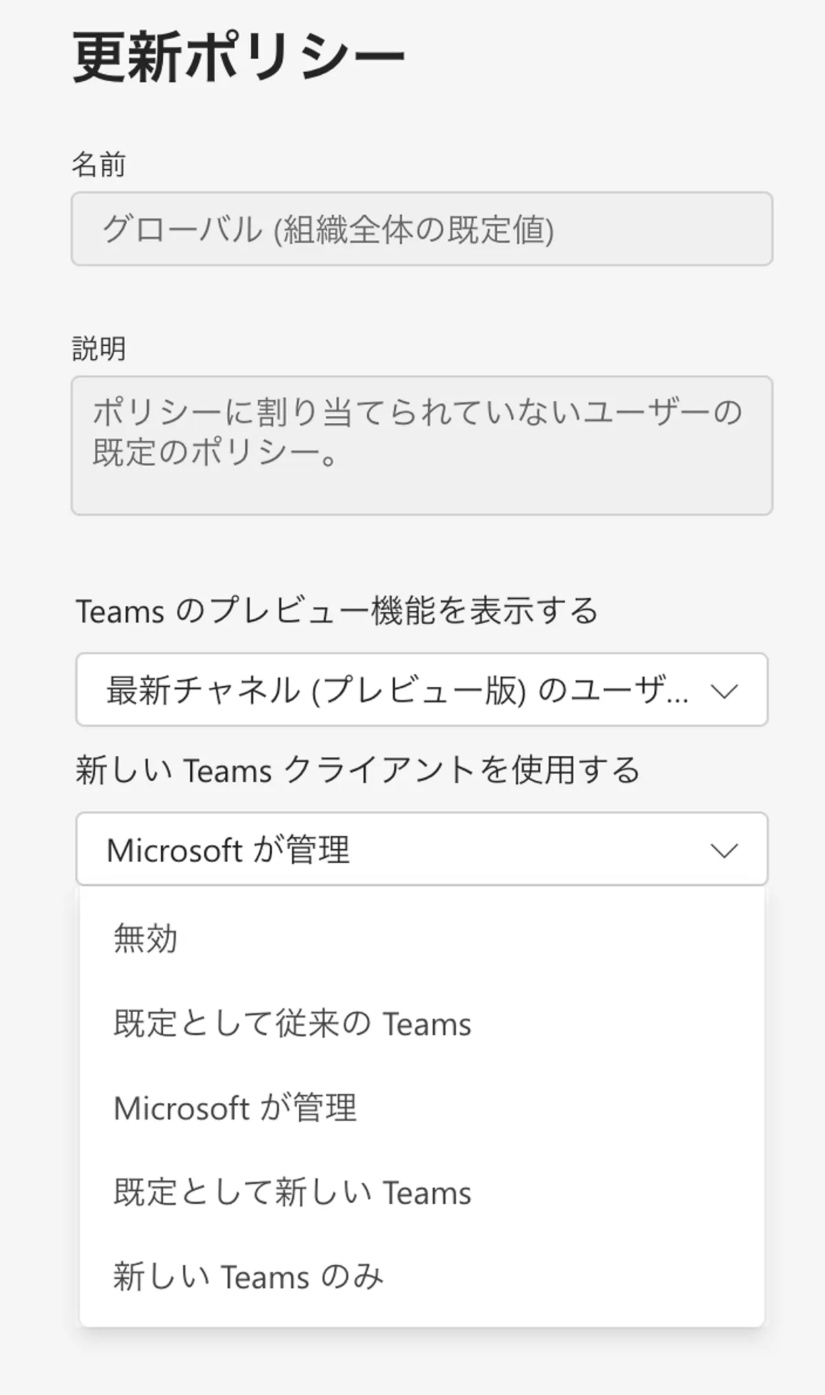 「Admins may choose to control their new Teams rollout by setting the Teams update policy for their users (as described in: Upgrade to the new Teams client using policies – Microsoft Teams | Microsoft Learn.) 」と当該メッセージ内にてNew Teamsへの切替はTeams更新ポリシーで制御すると触れられていますので、まずTeams更新ポリシーについて説明します。
