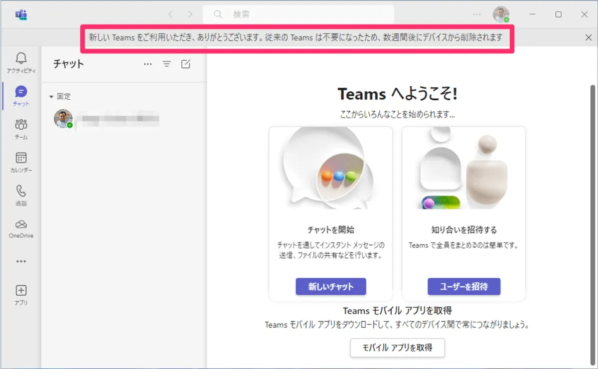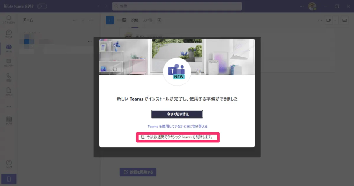 New TeamsおよびClassic Teamsを起動した際にClassic Teamsの削除が予告されます。その他の振る舞いは「既定として新しいTeams」と変わりません。learnドキュメントから14日後に削除されると推測されます。