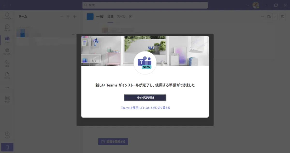 - Classic Teamsを起動するとNew Teamsへの切替UIが表示され、即時切替または次回起動時はNew Teamsが起動されるようになります