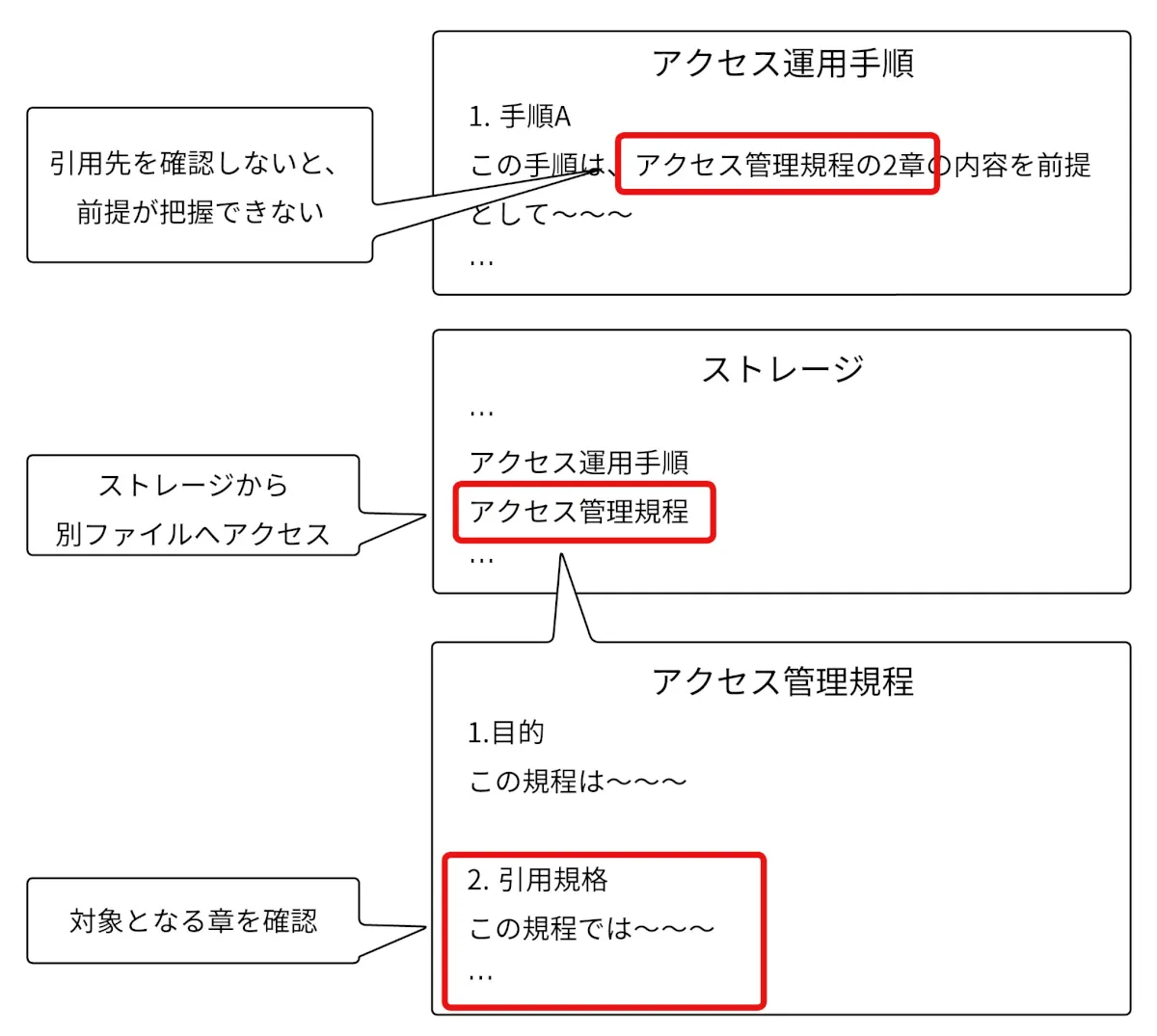 内容を確認したい閲覧者は、クラウドストレージ上から書類Aを検索し、書類Aが見つかればそこから4章へ移動することで、ようやく確認できます。たどり着いたとしても、書類Aの4章に「この作業は書類Bの2章の基準に従う」と書いてあったなら、また旅が始まります。