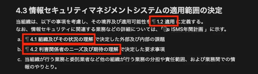 また、適用宣言書の管理策毎にブロックへのリンクをコピーし、規程の関連する章へリンクメンションとして貼り付けます。