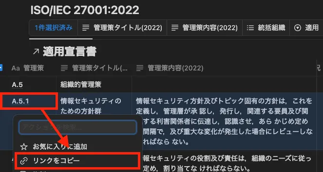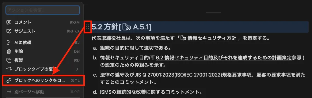 管理策に対して、具体的な取り組みを定める規程を開き、ブロックへのリンクをコピーします。コピーしたリンクは、適用宣言書へリンクメンションとして貼り付けます。