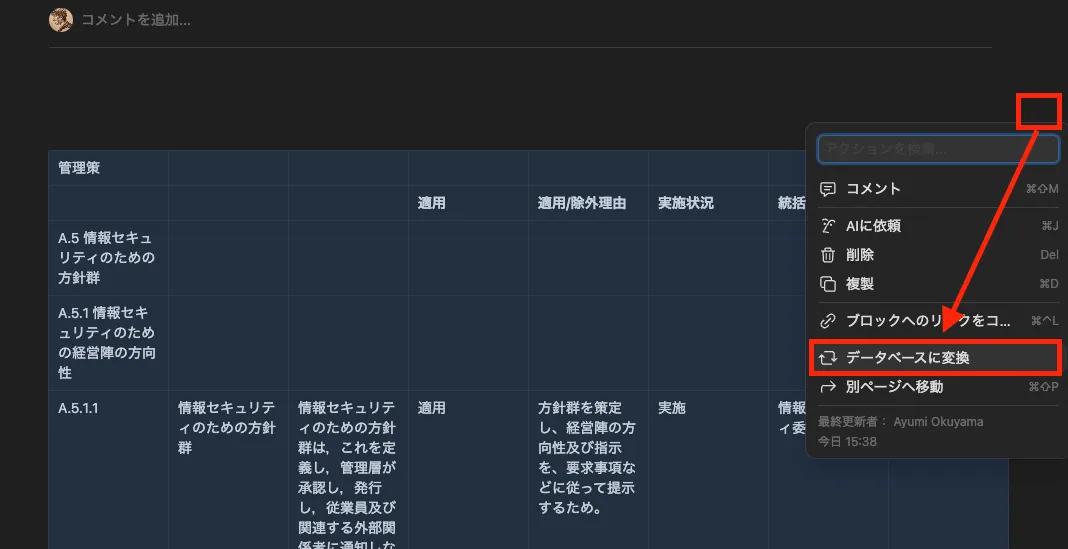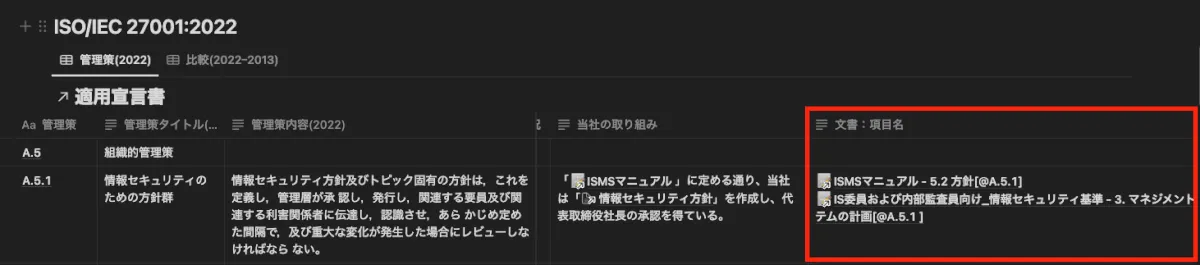 更に今回はリンクメンションの特性を活かし、これまでExcelで管理していた適用宣言書をNotionへ移行し、組織的管理策と規程文書の紐付けを行いました。これにより、監査などに自社の管理策の状況を説明しやすくなるとともに、規程文書を閲覧したユーザからも背景が確認できるようになりました。
