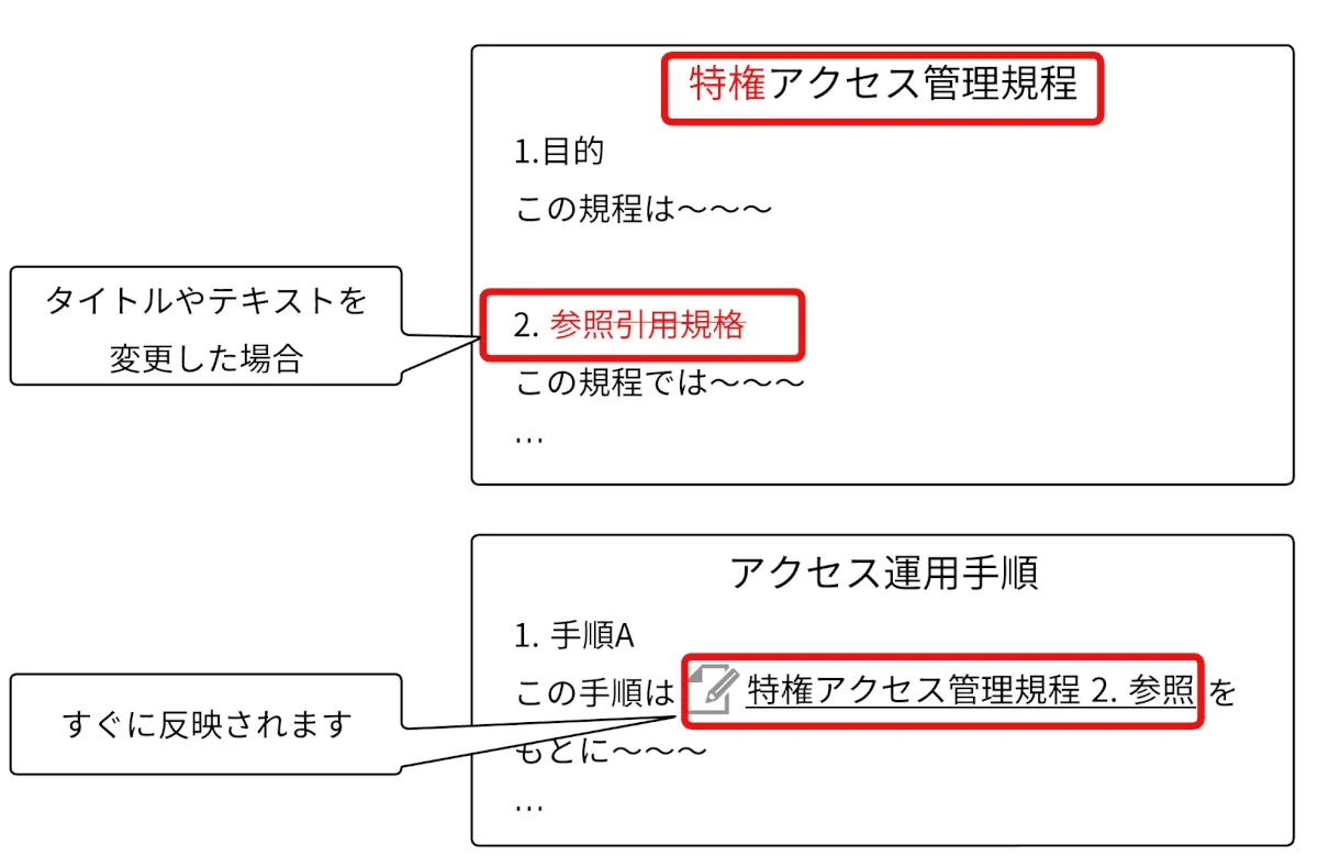 一般的なリンクの場合、規程文書のタイトルが変更された際などに変更が反映されず、作業者が定期的に規程文書を修正する必要がありました。特に文書の章や項番を指定している場合、章のナンバリングがズレることは頻繁に発生するため、次第に管理が面倒になります。