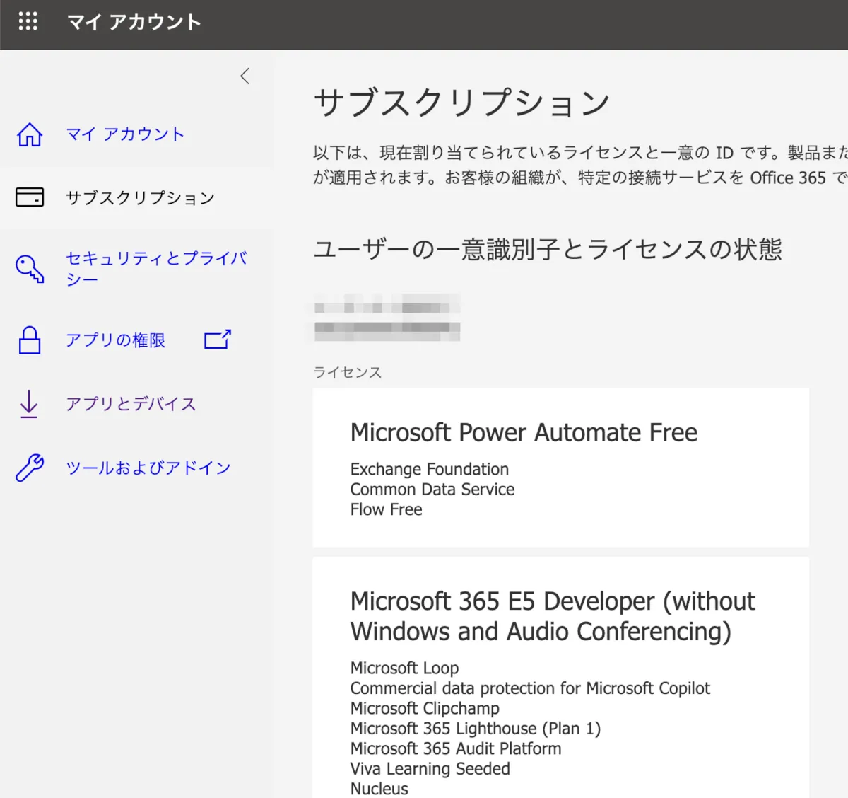 アプリやサービスの有効化状況はアカウント所持者自身もマイアカウントから確認可能です。こちらでは「Commercial data protection for Microsoft Copilot」とEntra管理センターと同じ表記となっています。
