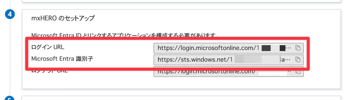 - 4にある、「ログインURL」と「Microsoft Entra識別子」のURLを控えておきます。