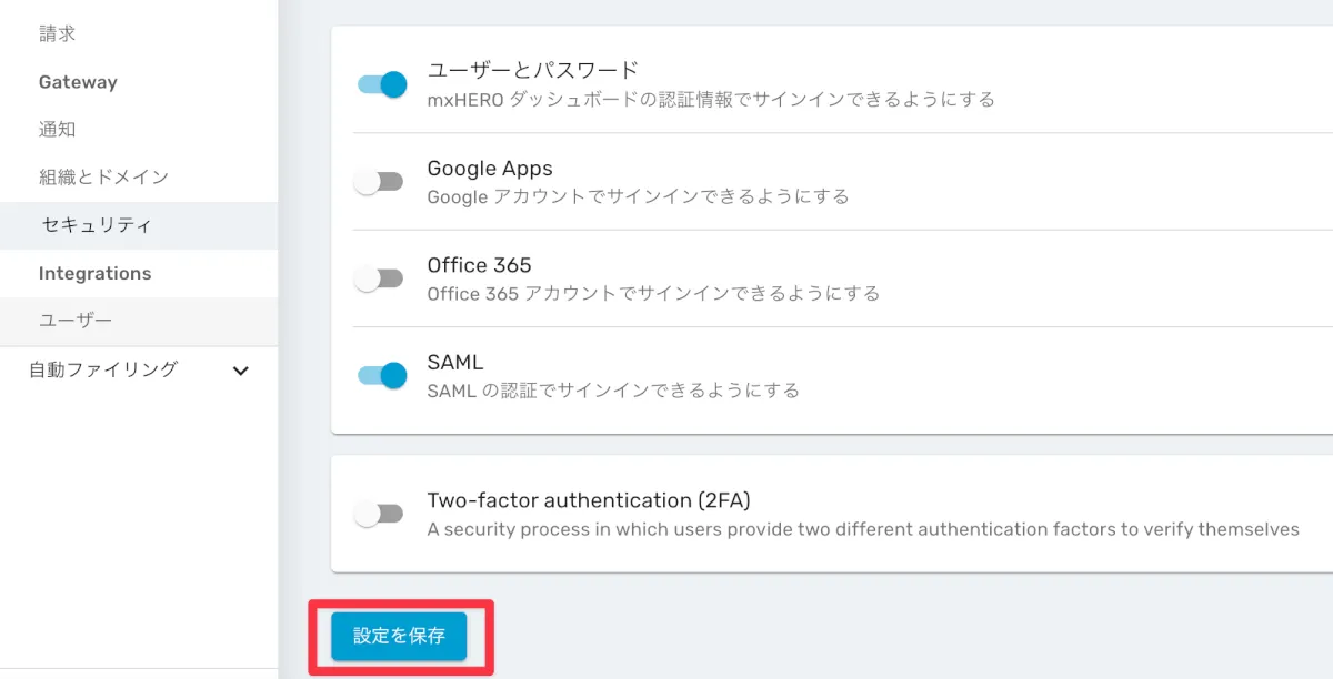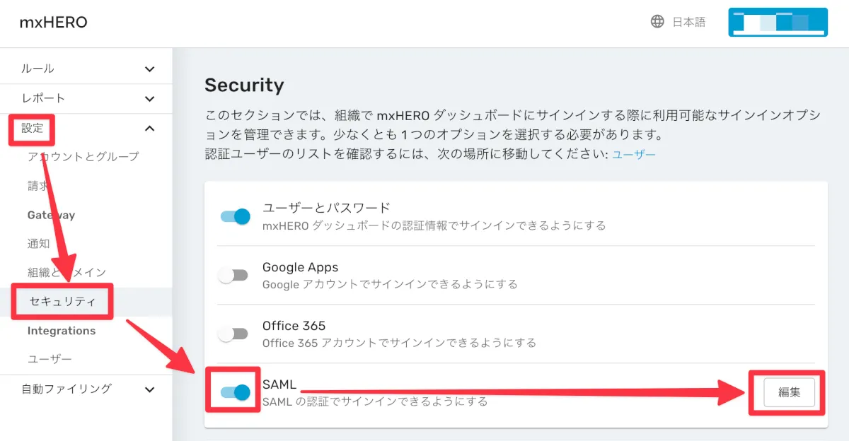 mxHEROでSAMLを有効にし、必要な情報を設定する