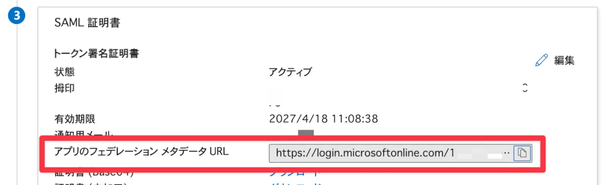 - 3にある、「アプリのフェデレーションメタデータURL」にアクセスします。