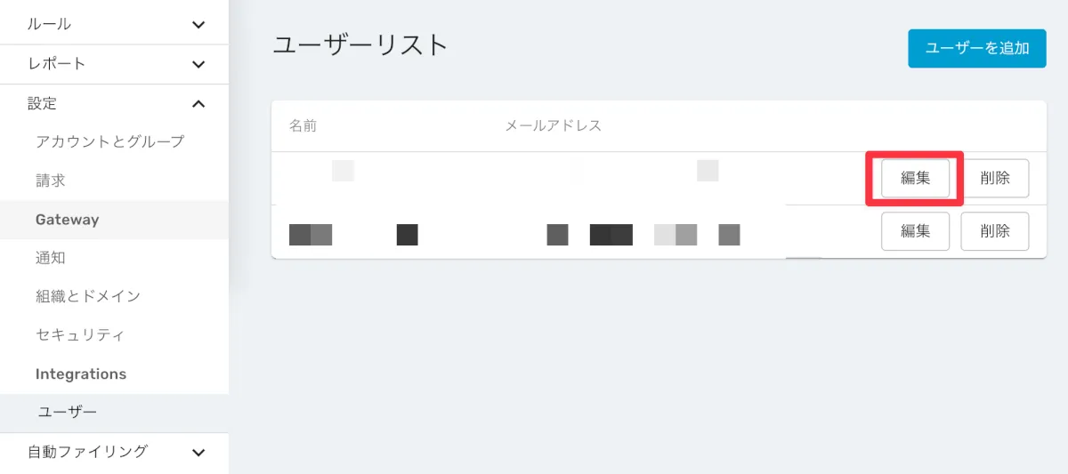 - ユーザー一覧画面上で、SSO対象ユーザー横にある【編集】をクリックします。