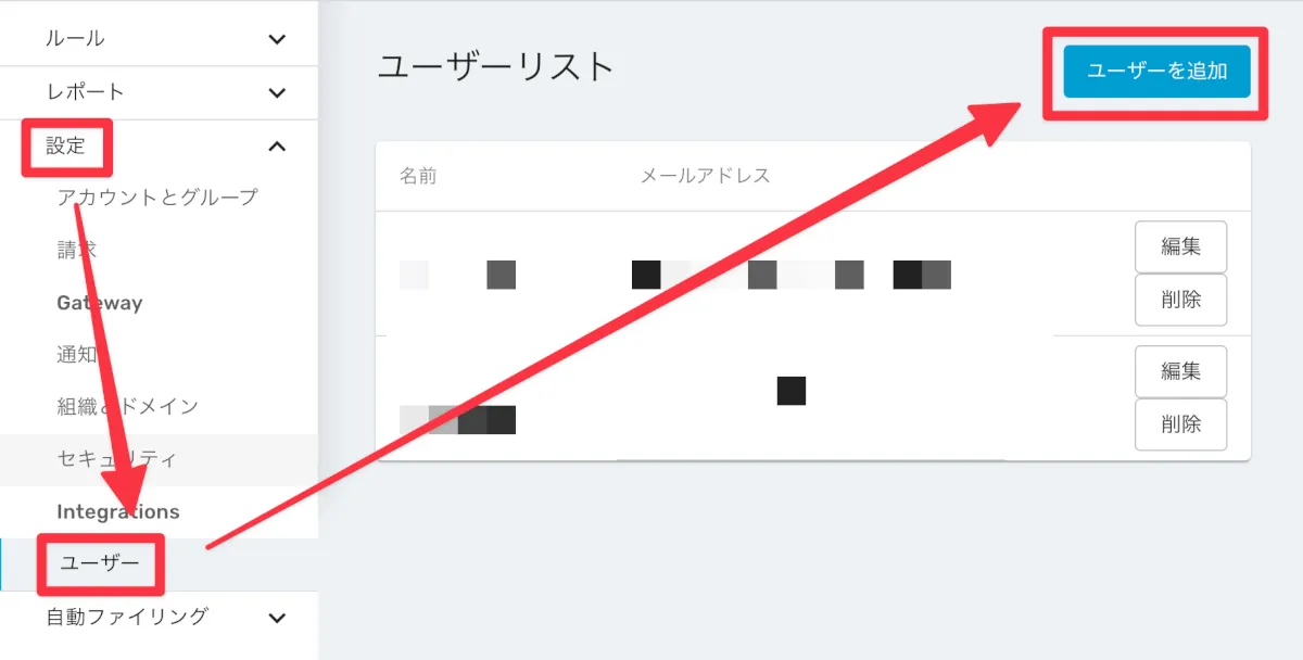 - 「設定」→「ユーザー」→【ユーザーを追加】をクリックします。