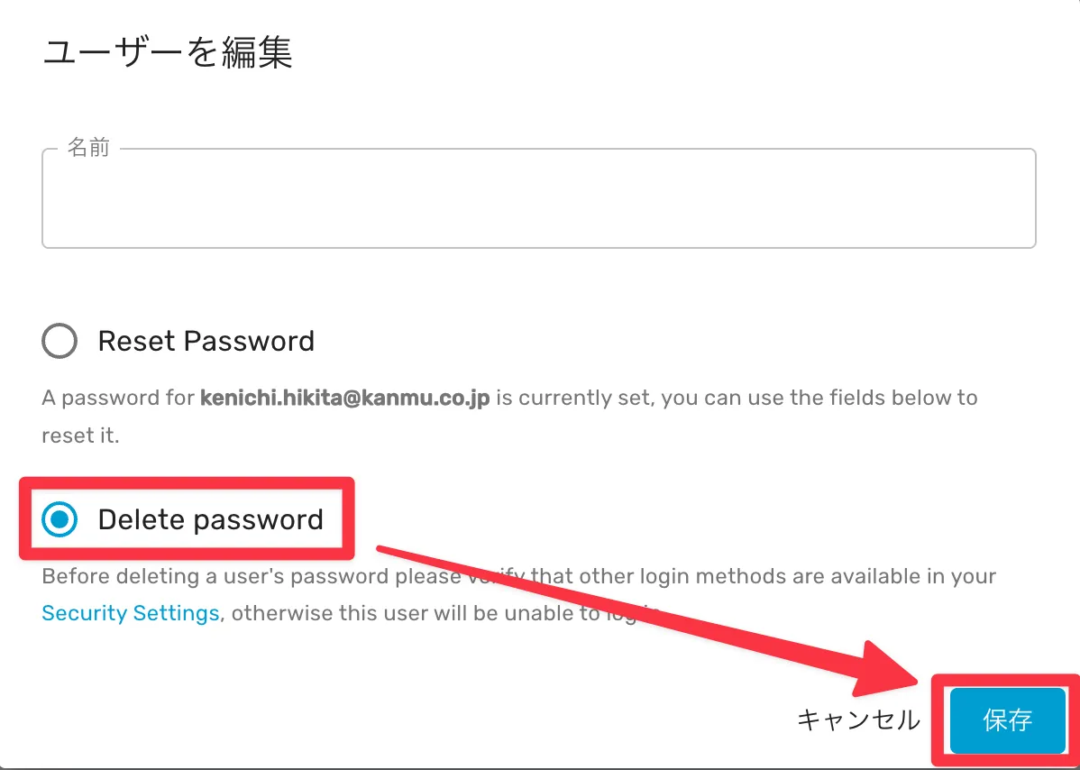 SSOユーザーはパスワードを持っていないほうがセキュアなので、ログイン用パスワードを削除してしまいます。