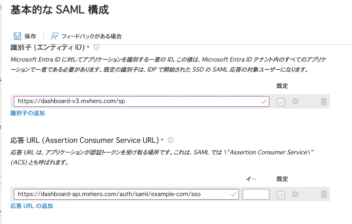 - 識別子(エンティティID)に、「https://dashboard-v3.mxhero.com/sp」と入力します。
