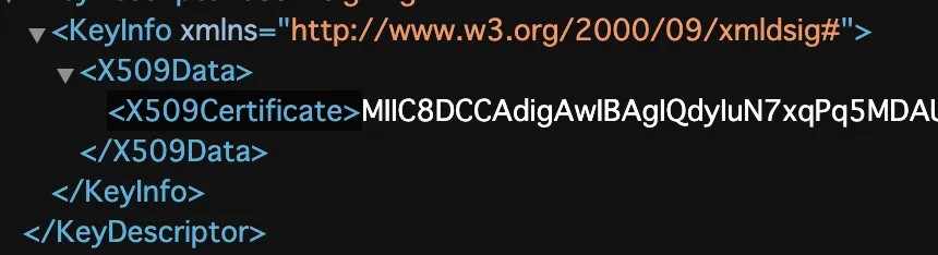 - 表示されたxmlから、<X509Certificate></X509Certificate>で挟まれている値を控えておきます。