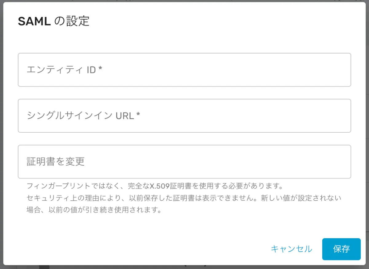 - 「設定」→「セキュリティ」→「SAML」トグルを有効化し、【編集】をクリックします。
