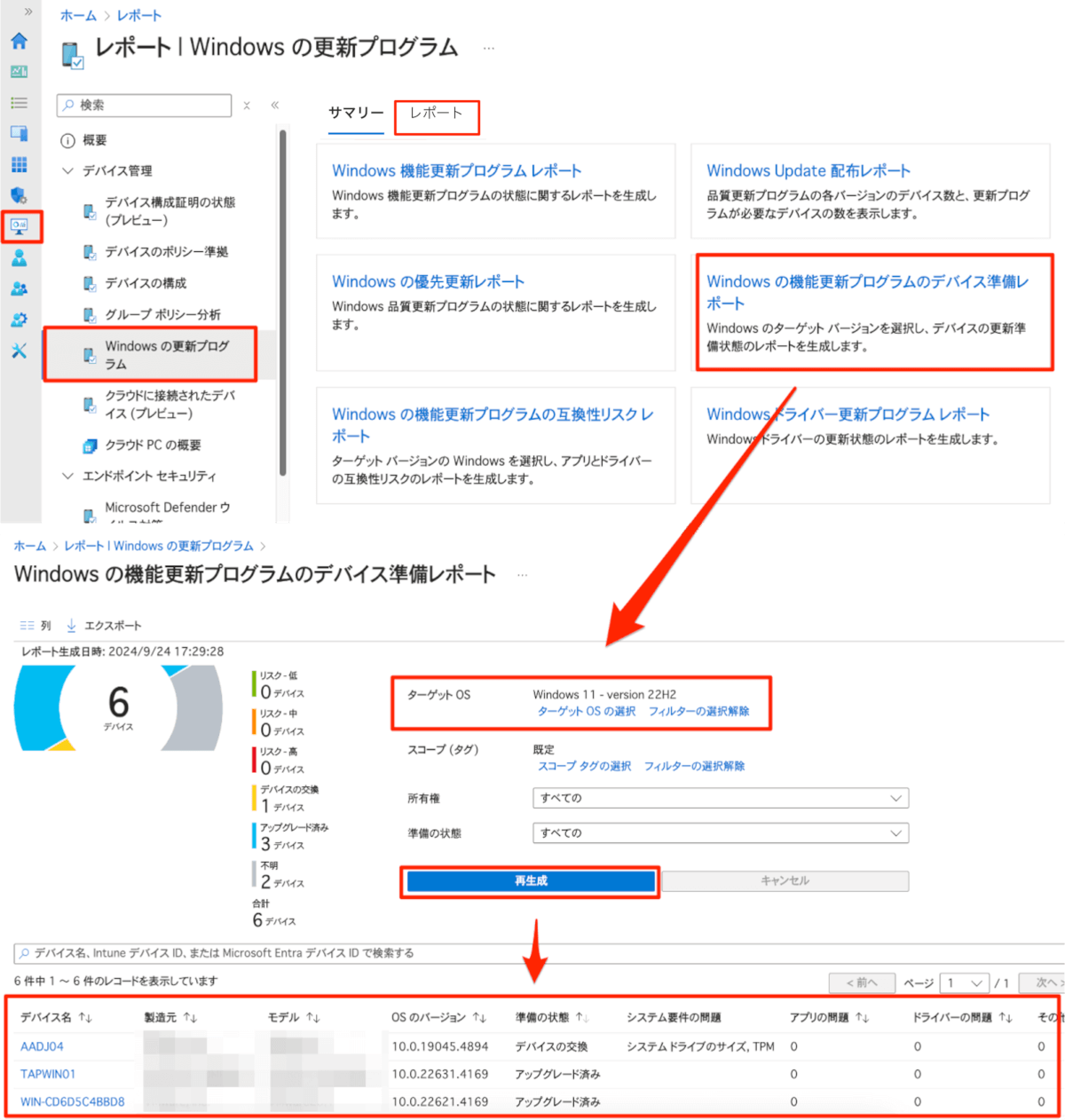 [レポート] > [Windows の更新プログラム] > [レポート] タブ > [Windows 機能更新プログラムのデバイス 準備レポート] からターゲットの OS バージョンを指定して [生成または再生成] ボタンをクリックすると各端末がアップグレードする際の機能更新プログラム対応状況が確認できます。