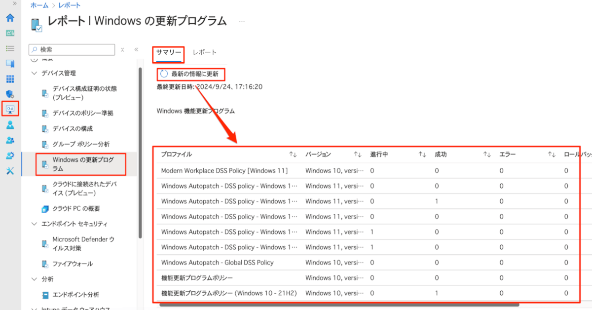 [レポート] > [Windows の更新プログラム] > [サマリー] タブから “最新の情報に更新” をクリックすると機能更新プログラムポリシーごとの展開状況の概要が確認できます。