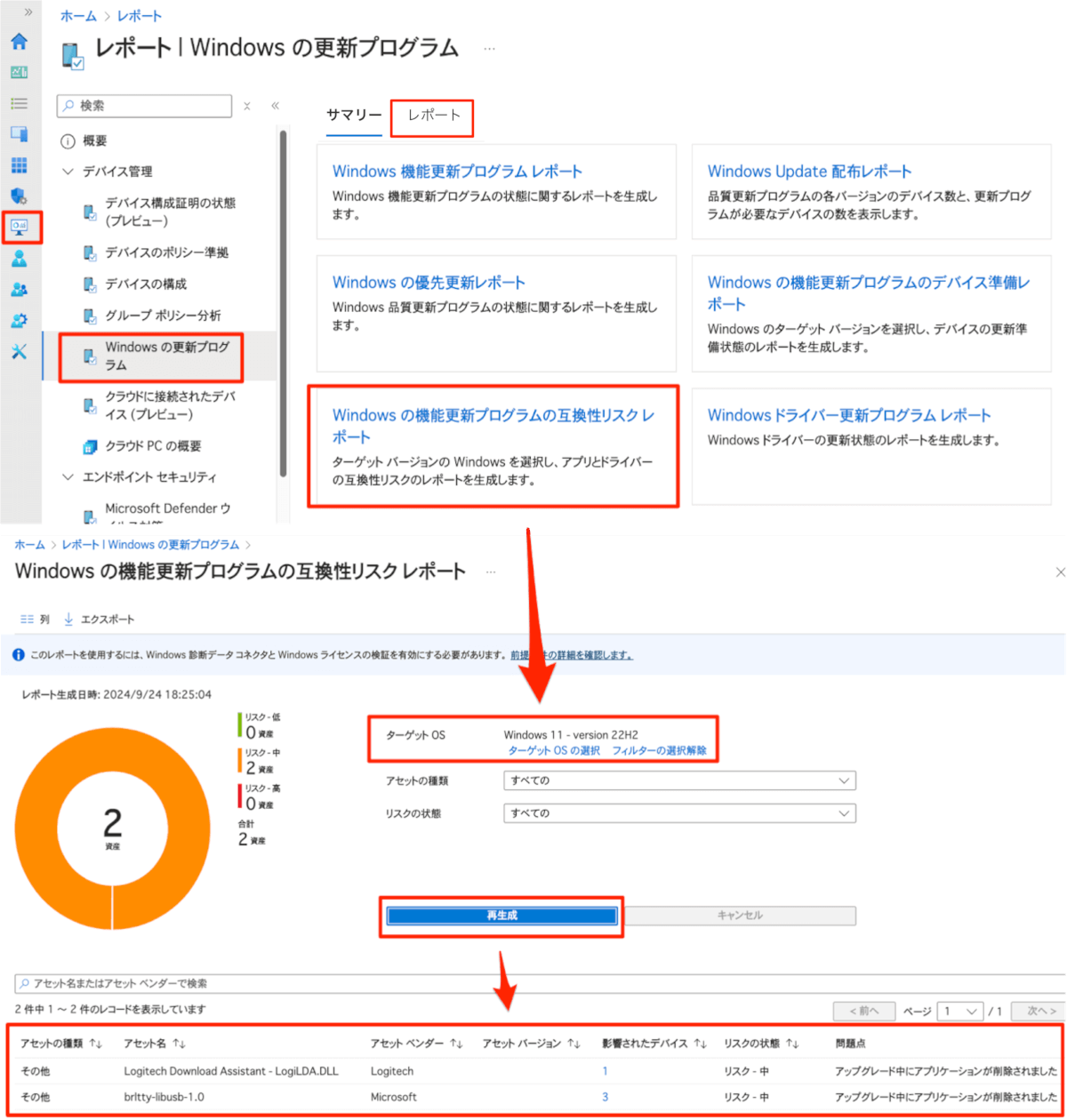 [レポート] > [Windows の更新プログラム] > [レポート] タブ > [Windows 機能更新プログラムの互換性リスク レポート] からターゲットの OS バージョンを指定して [生成または再生成] ボタンをクリックするとアプリやドライバーなどの互換性リスクや影響を受ける可能性がある端末を確認できます。