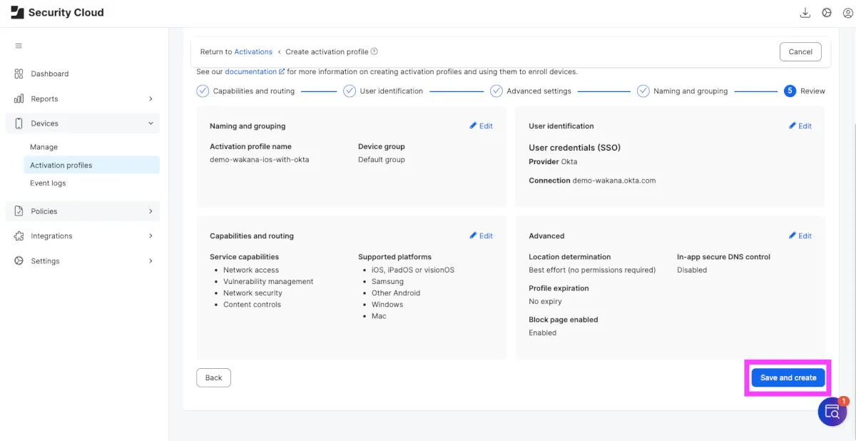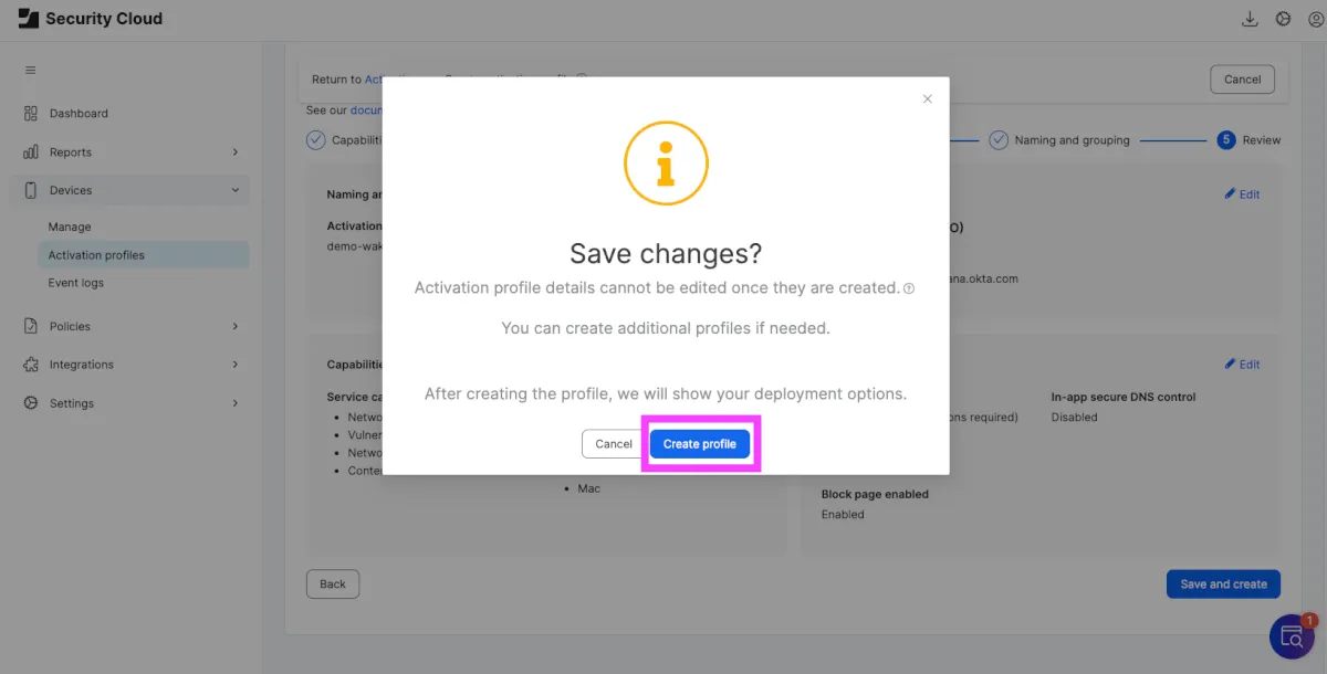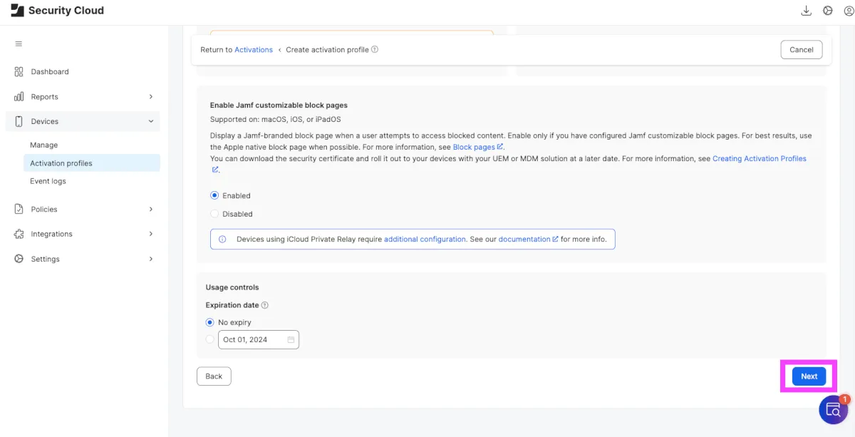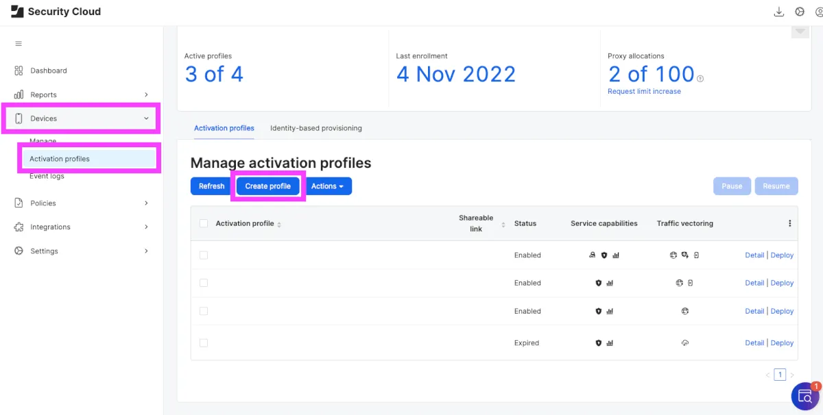 - Jamf Security CloudのDevicesから、Activation profilesを選択し、CreateProfilesボタンを押下します。