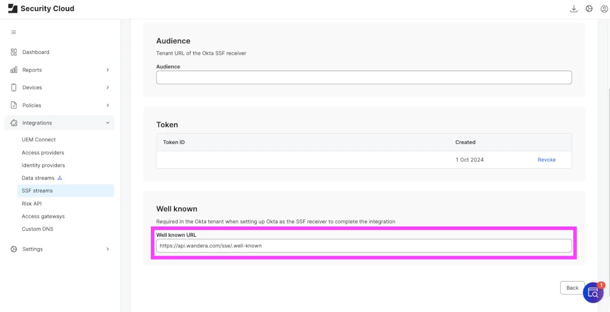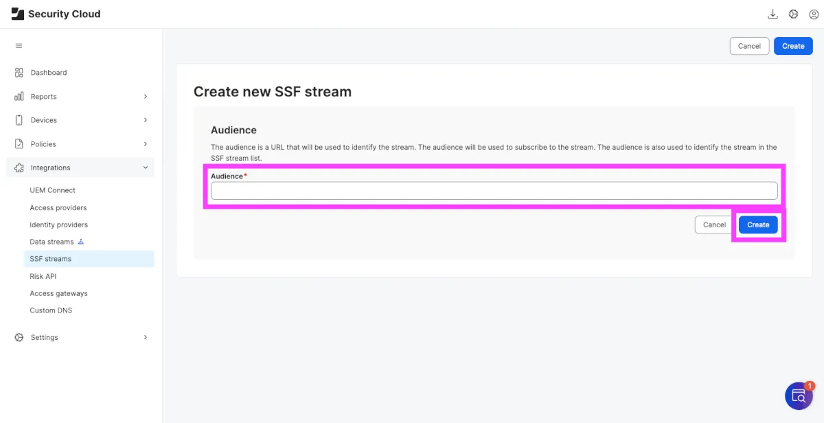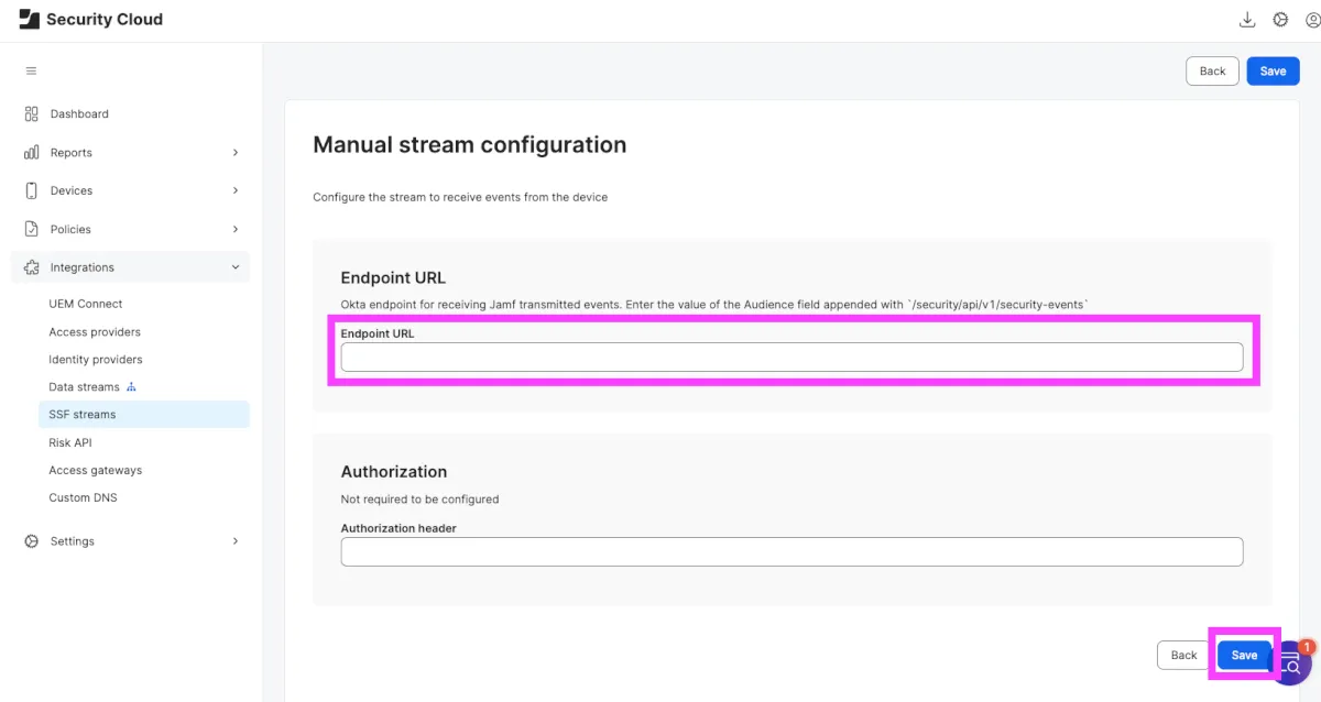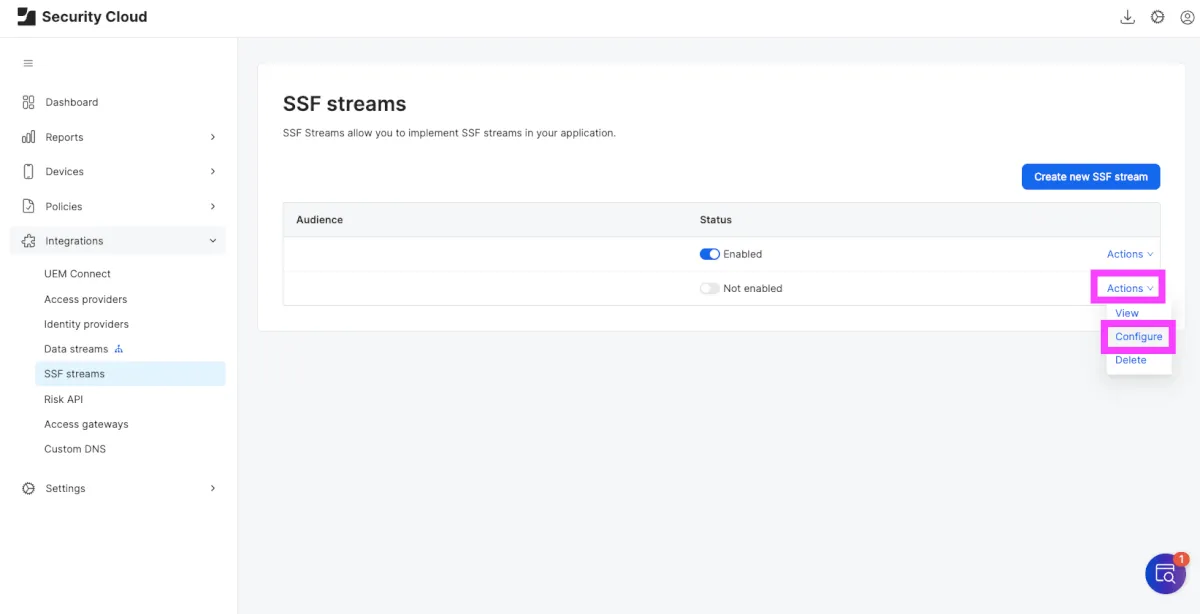 - Jamf Security CloudのIntegrationsから、SSF streamsを選択し、Create new SSF streamボタンを押下します。