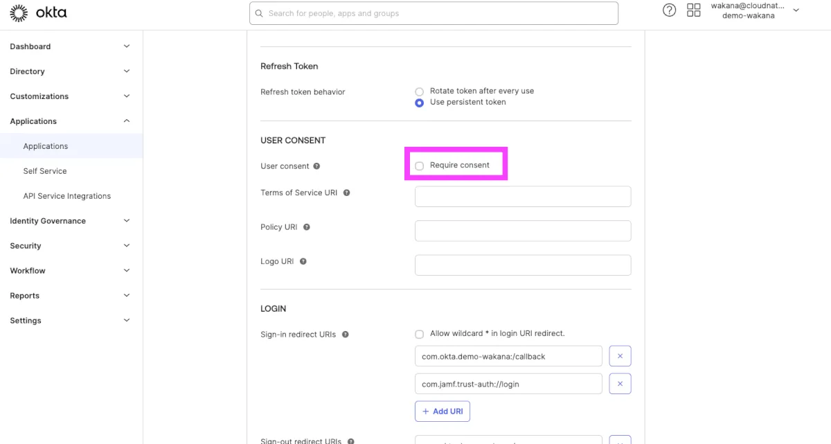 - 作成したアプリケーションに戻ります。GeneralタブのGeneral SettingsをEditし、User consentのRequire consentのチェックを外しSaveボタンを押下します。