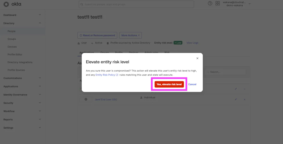 - 検証端末を再起動したらOktaでログが出力されました。Riskが検知され、先ほど作成したEntity Risk Policyがスケジュールされ無事Universal Logoutしました。
