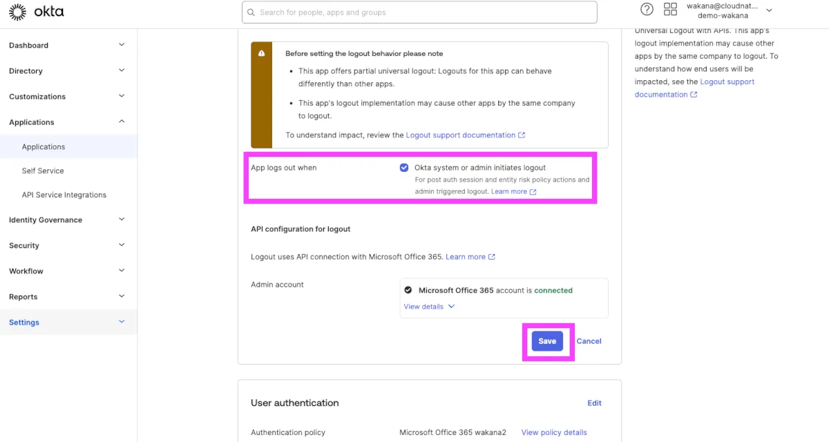- 今回はMicrosoft Office 365 アプリケーションのUniversal Logoutの設定をします。ApplicationsのAuthenticationタブの下方で設定できます。