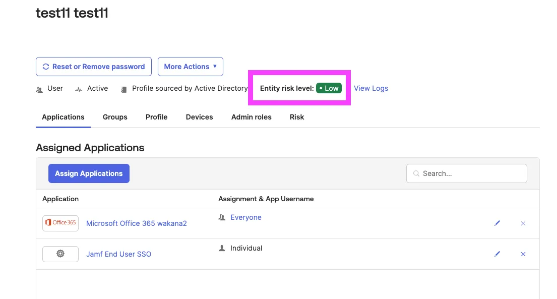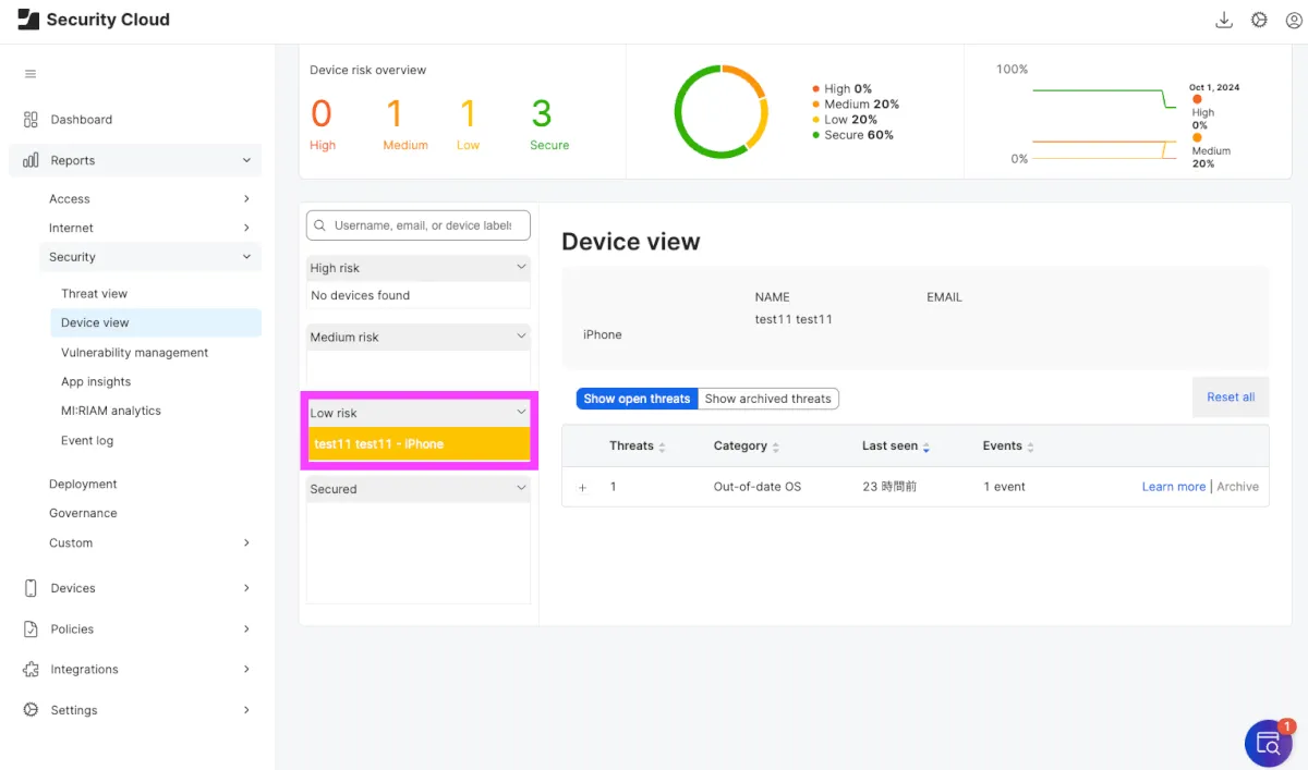 - Jamf Security CloudのDeviceレポートにもLow riskで検出されております。このアラートを活用してEntity Risk Policyに引っ掛けてみます。
