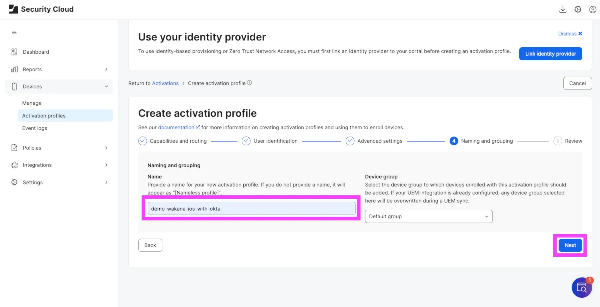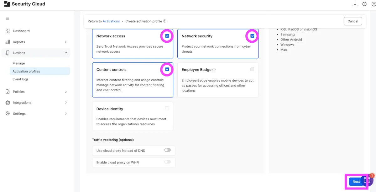 - 今回はiOS端末で検証するため、Network access、Network security、Content controlesにチェックマークを入れNextボタンを押下します。