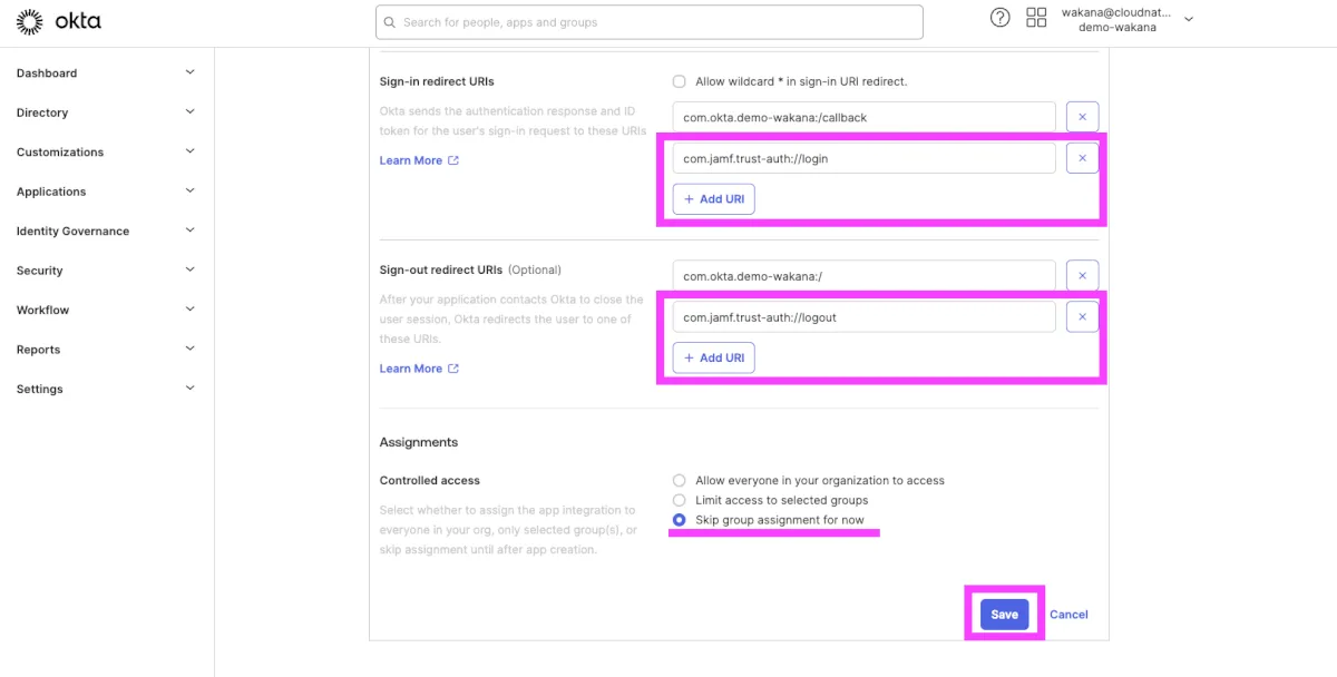 com.jamf.trust-auth://login、Sign-out redirect URIsにcom.jamf.trust-auth://logoutを追加し、Skip group assignment for nowを選択しSaveボタンを押下します。