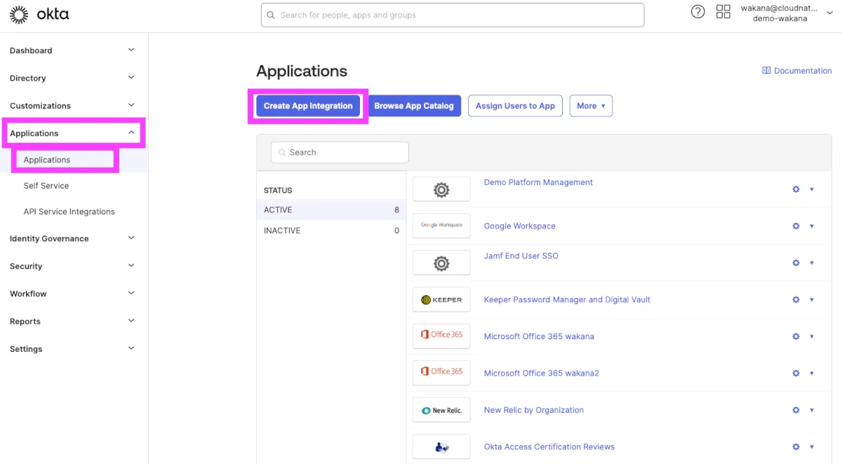 - Okta Admin ConsoleでApplicationsを選択し、Applicationsに移動します。Create App Integrationボタンを押下します。
