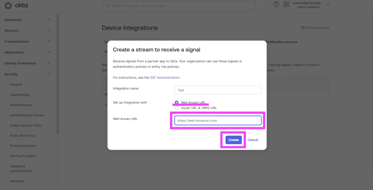 - Integration nameを入力します。Well-known URLを選択し、先ほど控えたJamf Security CloudのWell known URLを貼り付けてCreateボタンを押下します。