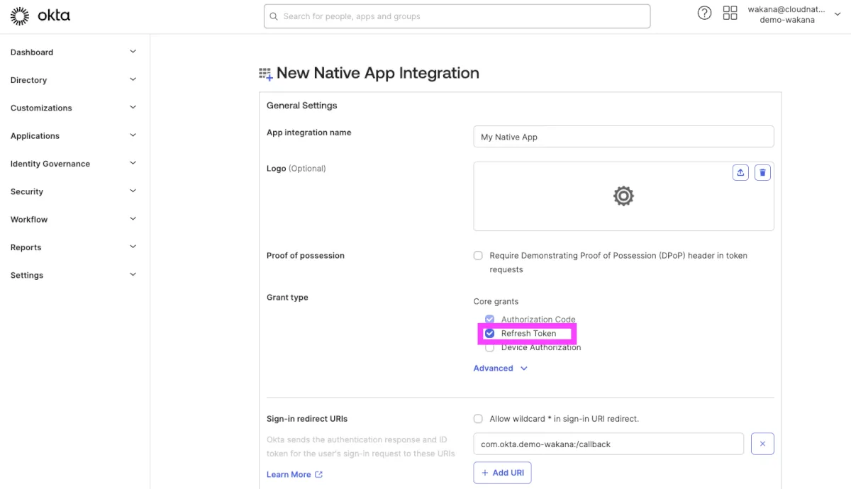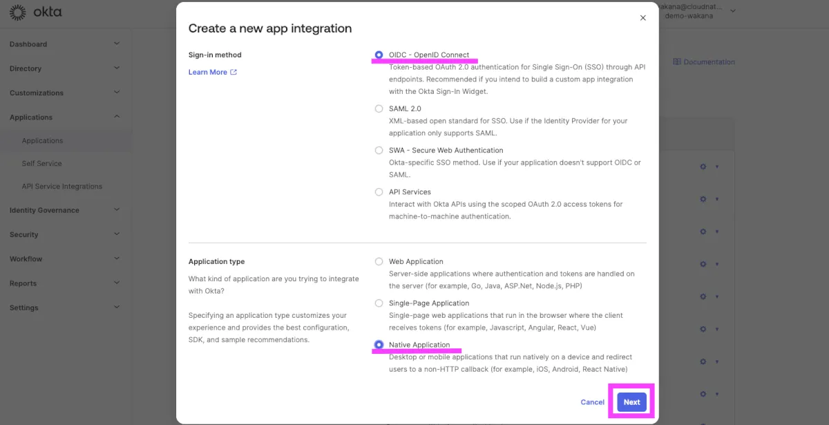 - OIDC – OpenID ConnectとNative Applicationを選択しNextボタンを押下します。