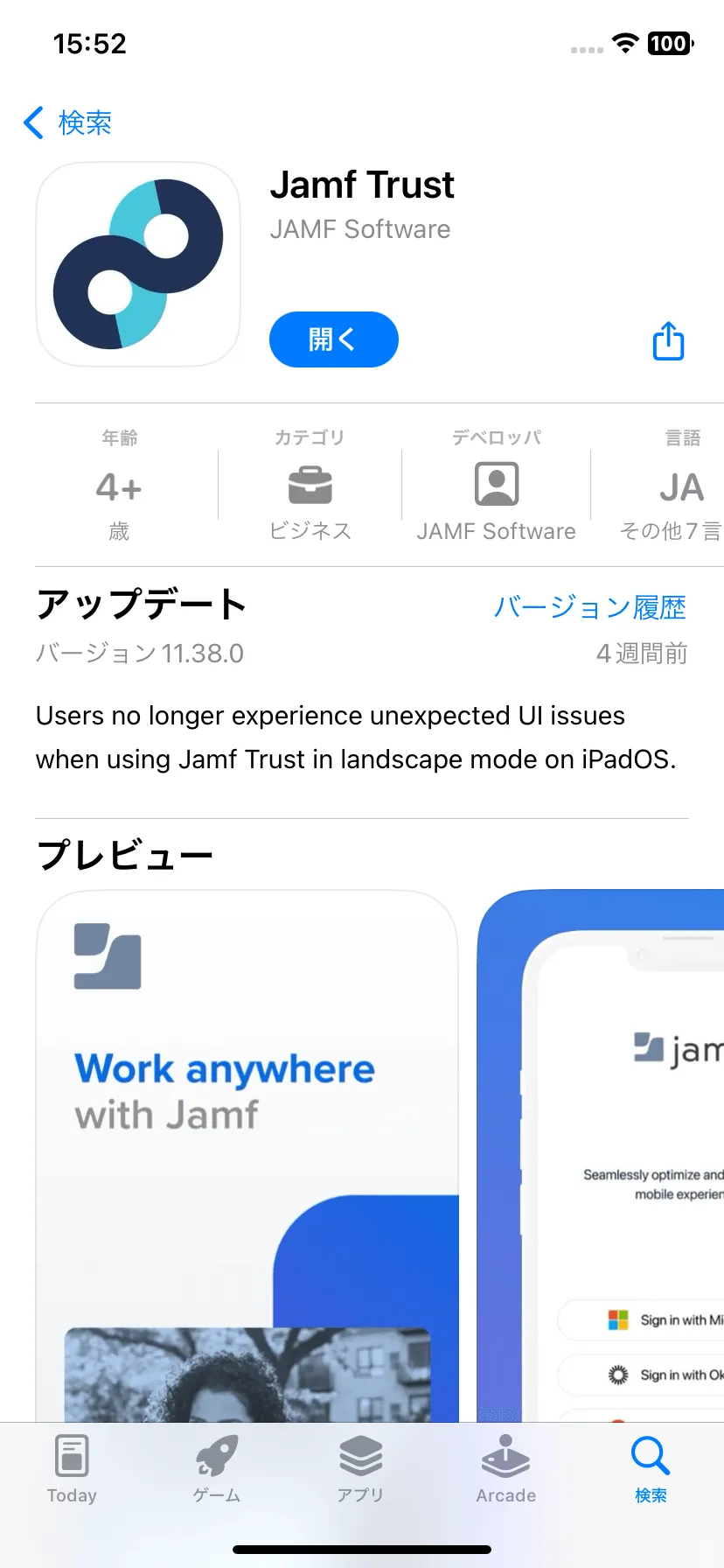 - QRコードが生成されるので、検証端末で読み込みます。Jamf Trust Appが無いとインストール画面に遷移します。