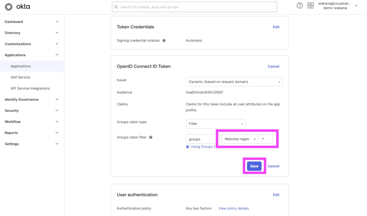 - AuthenticationタブのOpenID Connect ID TokenをEditし、Groups claim filterを