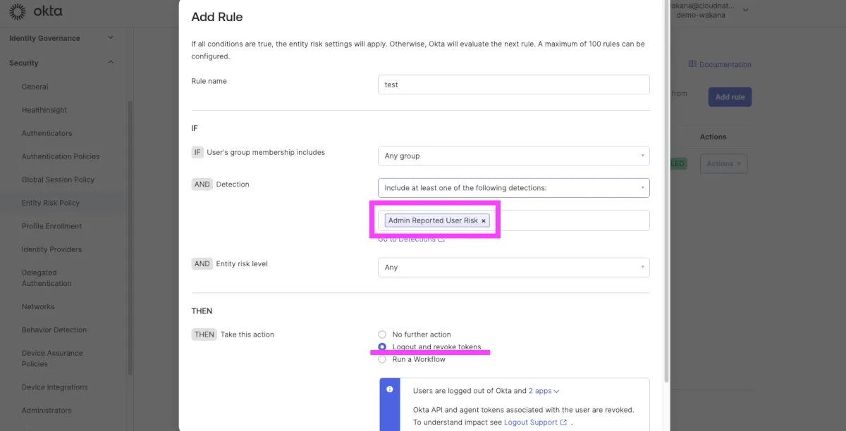 - 今回は検証なので、引っかけやすいルールを作成します。Admin Reported User RiskとLogout and revoke tokensを選択しSaveボタンを押下します。(ここでRun a Workflowを選択すると、Delegated Flowのトリガーにできます。)