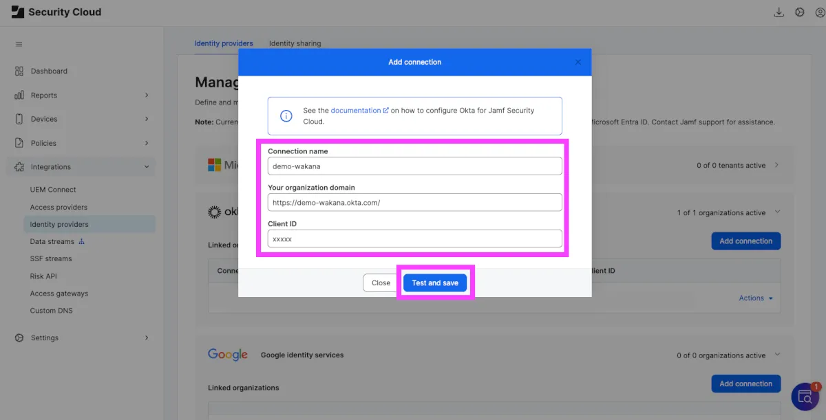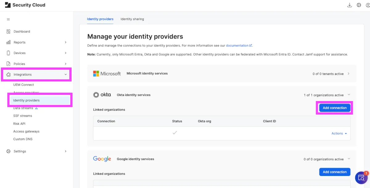 - Jamf Security CloudのIntegrationsから、Identity providersを選択し、Oktaの欄でAdd Connectionボタンを押下します。