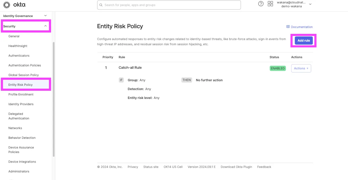 - まずはリスクを識別するためにEntity Risk Policyを作成します!Securityタブからアクセスし、Add ruleボタンを押下します。