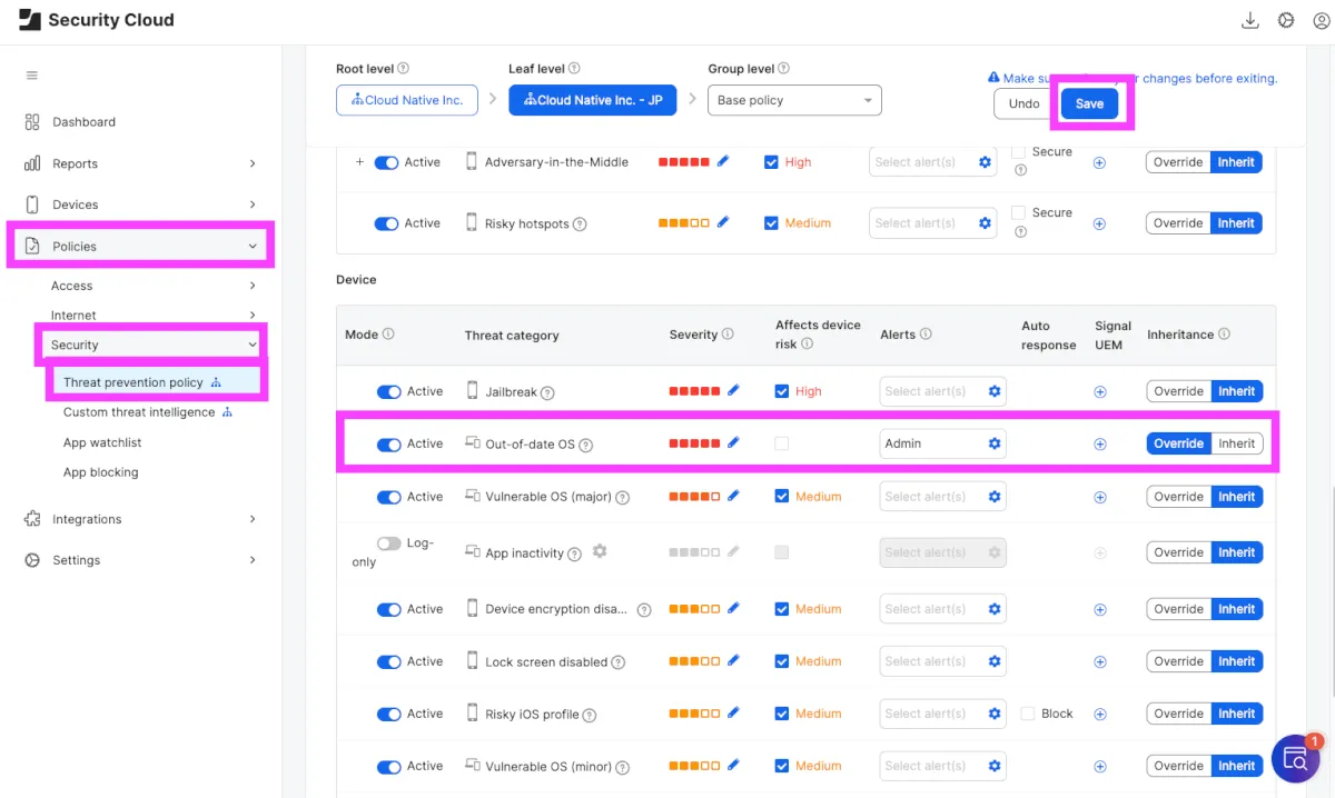 - SSFのアラートを無理やり飛ばすため、Jamf Security CloudのPoliciesからOut-of-date OSのSecurity Riskを一時的にHighに変更します。